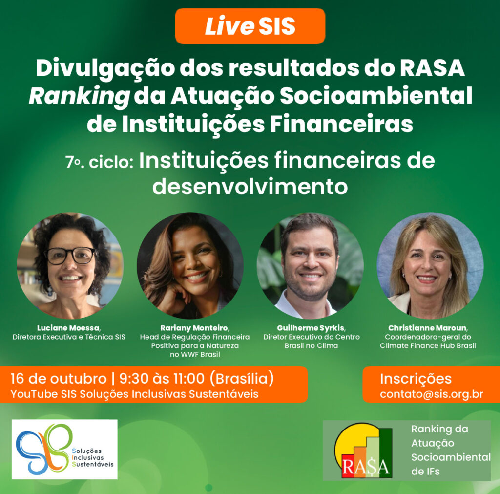 No dia 16 de outubro, venha participar conosco de mais uma live do RASA – Ranking da Atuação Socioambiental de instituições financeiras (rasa.org.br).