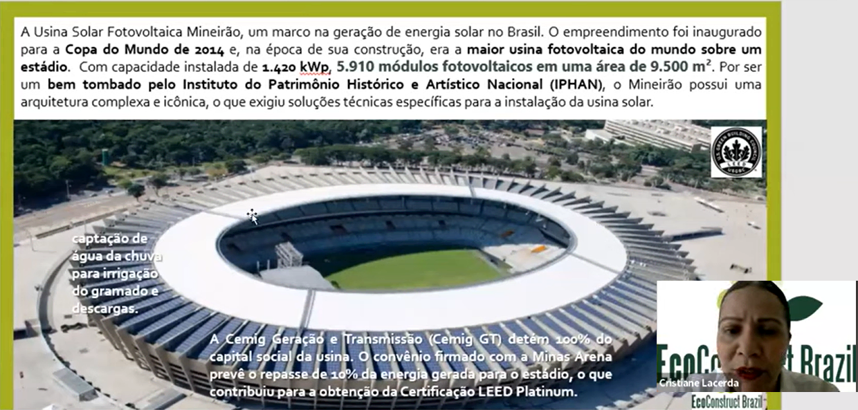 Cristiane Lacerda compartilhou exemplos práticos de projetos viáveis em termos de sustentabilidade, como o caso do Mineirão em 2014, com a maior usina fotovoltaica instalada em um estádio de futebol no mundo à época, bem como captação de água da chuva para irrigação do gramado, dentre outras soluções com comprovado impacto positivo, como o reaproveitamento de resíduos sólidos, o uso de películas 3M em vidros, para reduzir em 60% os impactos do calor, o uso de telhados verdes para reduzir ilhas de calor, o uso de lava-rodas em veículos para não espalhar poeira da construção nos arredores. Destacou sua satisfação com iniciativas como o selo azul da Caixa e o selo LEED, reconhecendo seu papel na valorização de soluções sustentáveis.