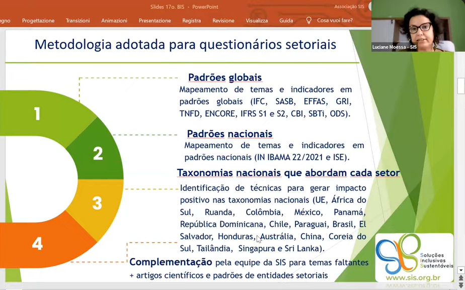 Luciane Moessa destacou a inovação metodológica da SIS, que foi a separação dos indicadores-chave de desempenho em duas categorias: aqueles para os quais a localização da atividade econômica é relevante, como gestão de efluentes ou poluição atmosférica; e aqueles para os quais a localização é irrelevante, como emissões de GEE e saúde e segurança do trabalho. Para ver os slides usados por Luciane, clique aqui.